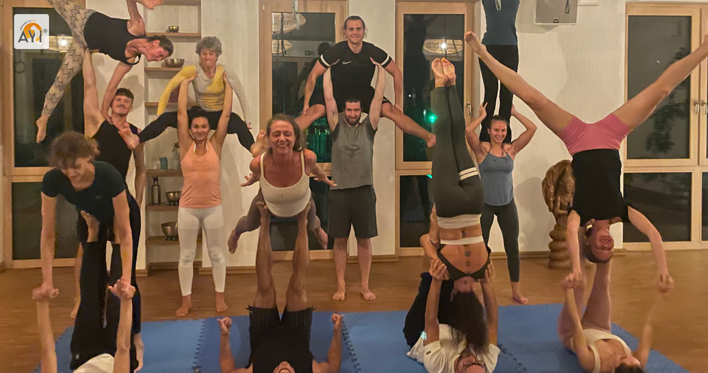 Eine JAM ist wie eine große Spielwiese für alle, die Lust auf Akrobatik-Yoga haben. So wie Musiker sich zum freien Jammen treffen, kommen wir hier zusammen, um gemeinsam zu üben, auszuprobieren und Neues zu kreieren. Jede*r bringt das ein, was sie oder er gerade übt, worauf er/sie Lust hat – und gemeinsam entsteht daraus ein bunter Mix aus Bewegung, Balance und Freude.
